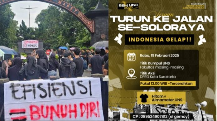 SOLO – Badan Eksekutif Mahasiswa (BEM) Universitas Sebelas Maret menyerukan aksi Seruan Turun ke Jalan se-Solo Raya di Gedung DPRD Kota Solo, Rabu, 19 Februari 2025) pukul 13.00 WIB.