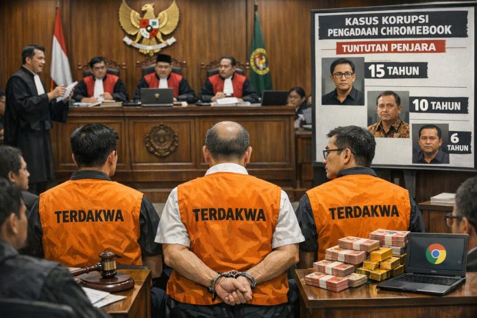 INNNEWS – Tiga terdakwa dalam kasus dugaan korupsi pengadaan perangkat Chromebook di lingkungan Kementerian Pendidikan, Kebudayaan, Riset, dan Teknologi (Kemendikbudristek) dituntut hukuman penjara antara 6 hingga 15 tahun. Dari ketiganya, seorang konsultan teknologi disebut menerima tuntutan paling berat.