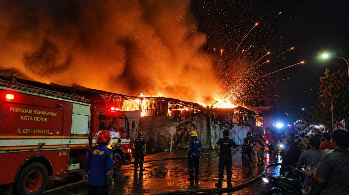 INNNEWS-Depok – Sebuah gudang ekspedisi di kawasan Jalan Proklamasi, Sukmajaya, Kota Depok, dilaporkan terbakar hebat pada Minggu malam, 26 April 2026. Peristiwa yang terjadi sekitar pukul 22.00–22.15 WIB ini sontak mengundang perhatian warga sekitar karena kobaran api yang besar disertai suara ledakan dan percikan api berwarna-warni menyerupai pesta kembang api.
